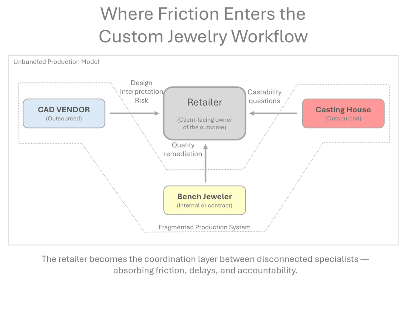 Most independent jewelers believe they understand their costs. What they don’t see is the cost created in between. This paper is about the Frankenstein Tax—the hidden operational penalty paid by jewelers who assemble custom production from disconnected, “best-price” vendors. On paper, this model looks flexible andefficient. In practice, it quietly consumes time, margin, and attention.
